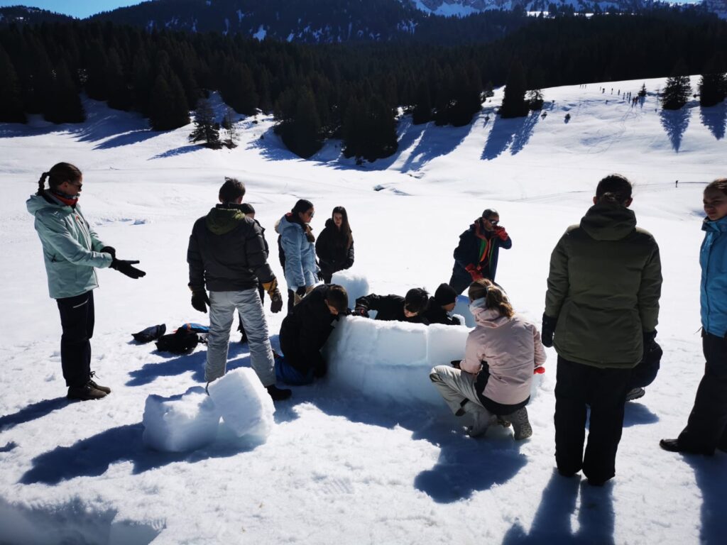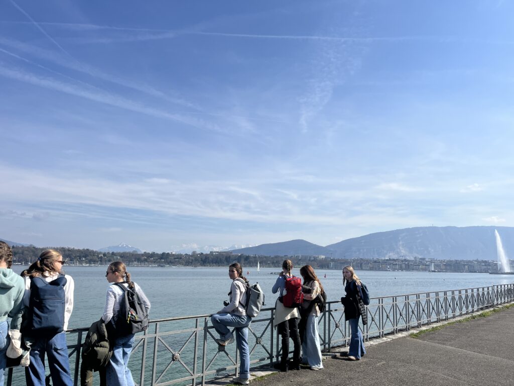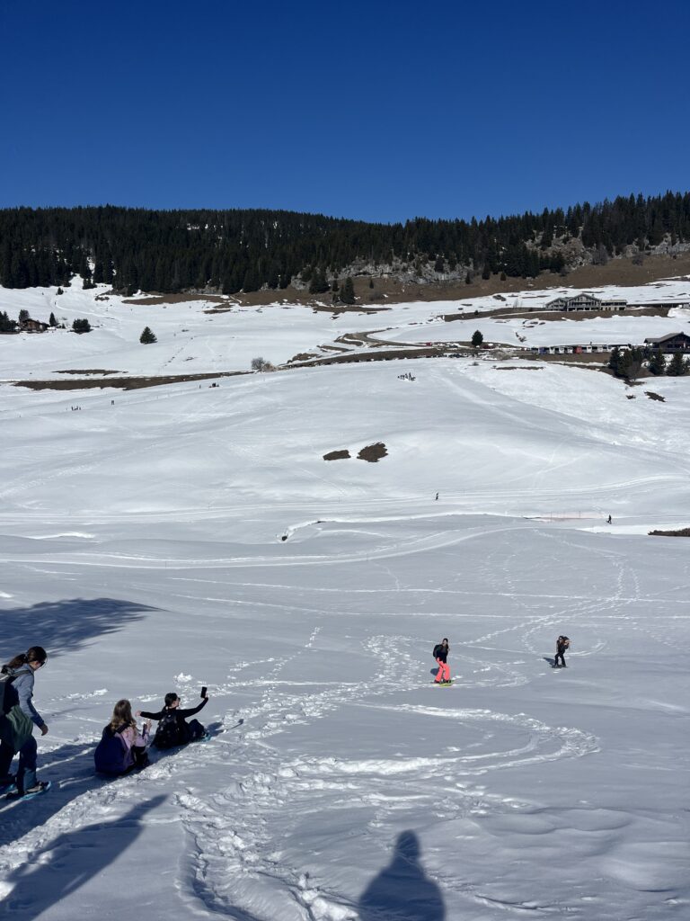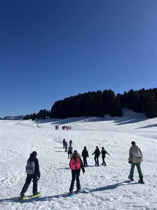 Nach der langen Busfahrt, einmal durch die gesamte Schweiz, war die Freude darüber natürlich besonders groß. Wir freuten uns auch über das Wiedersehen nach drei Monaten, denn unsere französischen Austauschpartner waren bereits im Dezember bei uns gewesen und hatten sich nach einer ereignisreichen Woche mit vielen Aktivitäten und einem feierlichen Abschiedsabend voller Wehmut verabschiedet. In Bonneville erwartete uns ein ebenfalls abwechslungsreiches Programm: ein gemeinsamer Unterrichtsbesuch, bei dem wir die Vorzüge des deutschen Schulsystems wieder mehr zu schätzen lernten (vor allem das vergleichsweise frühe Unterrichtsende), Schneeschuhwanderung in den Bergen, Ausflug nach Chamonix mit dem Gletscher Mer de Glace, der von Jahr zu Jahr weiter zurückgeht, eine Rallye durch das Reblochon-Museum, dem traditionellen Käse aus der Haute-Savoie, Freizeit in der wunderschönen Stadt Annecy, dem Venedig der Alpen, sowie der bewährte Ausflug nach Genf zur UN, wo wir einer Sitzung des Menschenrechtsrates beisitzen durften, und zum Internationalen Rotkreuz- und Rothalbmondmuseum. Ein besonderes Highlight war in diesem Jahr am letzten Abend die Nachtwanderung „Alta Lumina“, bei der wir uns von Lichtern und Tönen durch den Wald führen lassen durften.