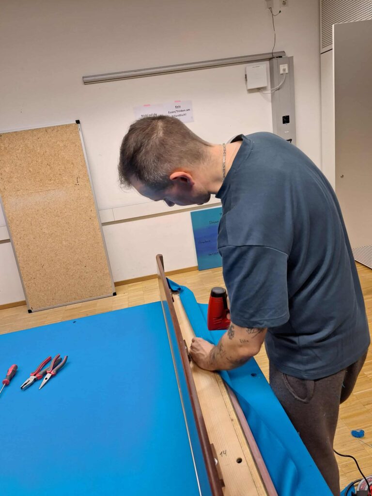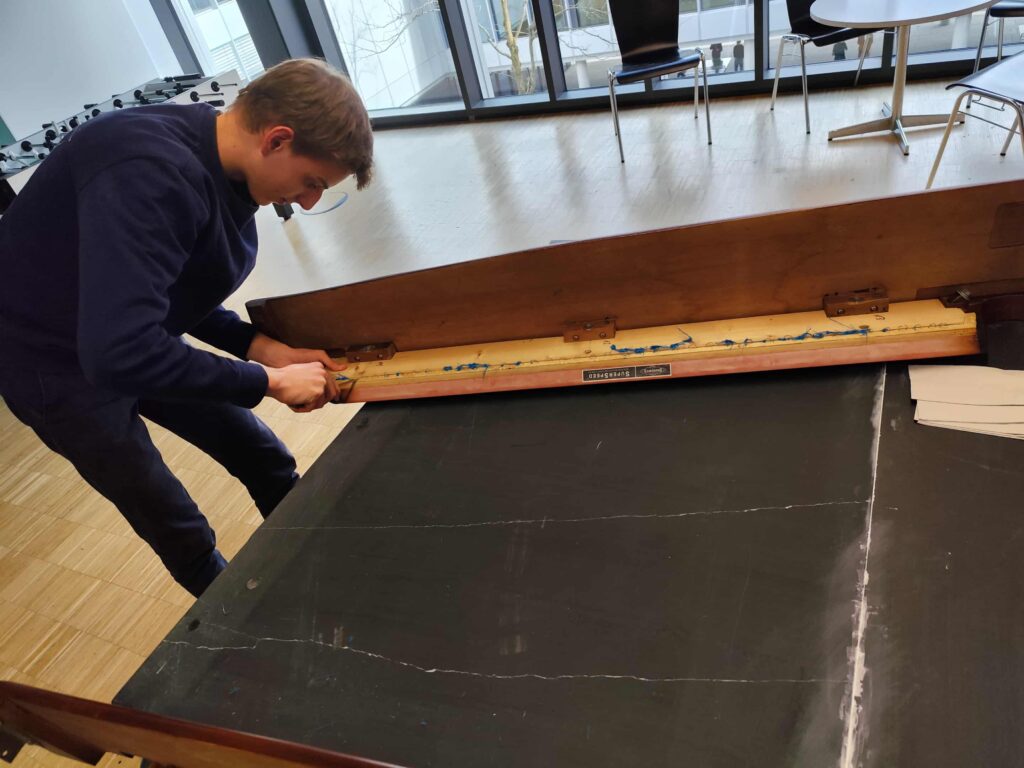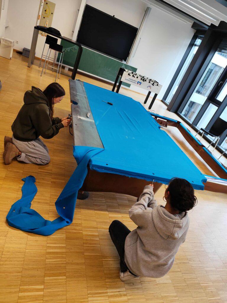 Nach zwei Jahren wurde es dringend Zeit das Tuch auf unserem Profi-Tisch zu erneuern. Das alte Tuch wird dazu runtergerissen und anschließend müssen unzählige Tackerklammern mühselig aus dem Holz entfernt werden – hätten mir die Kids von der Billard-AG dabei nicht unter die Arme gegriffen, hätte ich dafür allein schon ein paar Stunden gebraucht. Mit etwas handwerklichem Geschick haben wir nun ein frisches Simonis 860-Tuch in Tournament Blue bezogen. Da wir das in Eigenregie und ohne professionellen Tablefitter bewerkstelligt haben, konnten wir uns ein dreistelliges Arbeitshonorar sparen! Der Unterschied zwischen einem neuen und einem alten Tuch lässt sich ungefähr so beschreiben, als ob man beim Tennis auf Rasen oder auf Sand spielt.