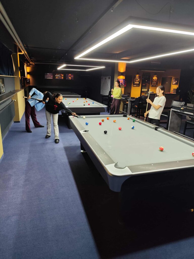 In diesem Jahr können wir außerdem ein bis zwei Mal im Monat das moderne Trainingszentrum in Kirchheim nutzen. So haben die Schülerinnen und Schüler der AG endlich genug Platz zum Trainieren. Unser eigener Tisch ist zwar sehr gut, für so viele begeisterte Sportler allerdings deutlich zu wenig. Das Trainingszentrum bietet hierbei die Möglichkeit auf einem Predator Apex, dem Tisch der Europameisterschaft, und einem Diamond Table, dem Tisch der Weltmeisterschaft zu spielen. Ein großer Dank geht hierbei an die Verantwortlichen des Max Pool Billard in Kirchheim, die dies für unsere AG möglich machen! Wir suchen allerdings immer noch nach einer sinnvollen Transportmöglichkeit nach Kirchheim – ich habe nämlich noch ganz viele Anfragen aus der 7. Klasse!